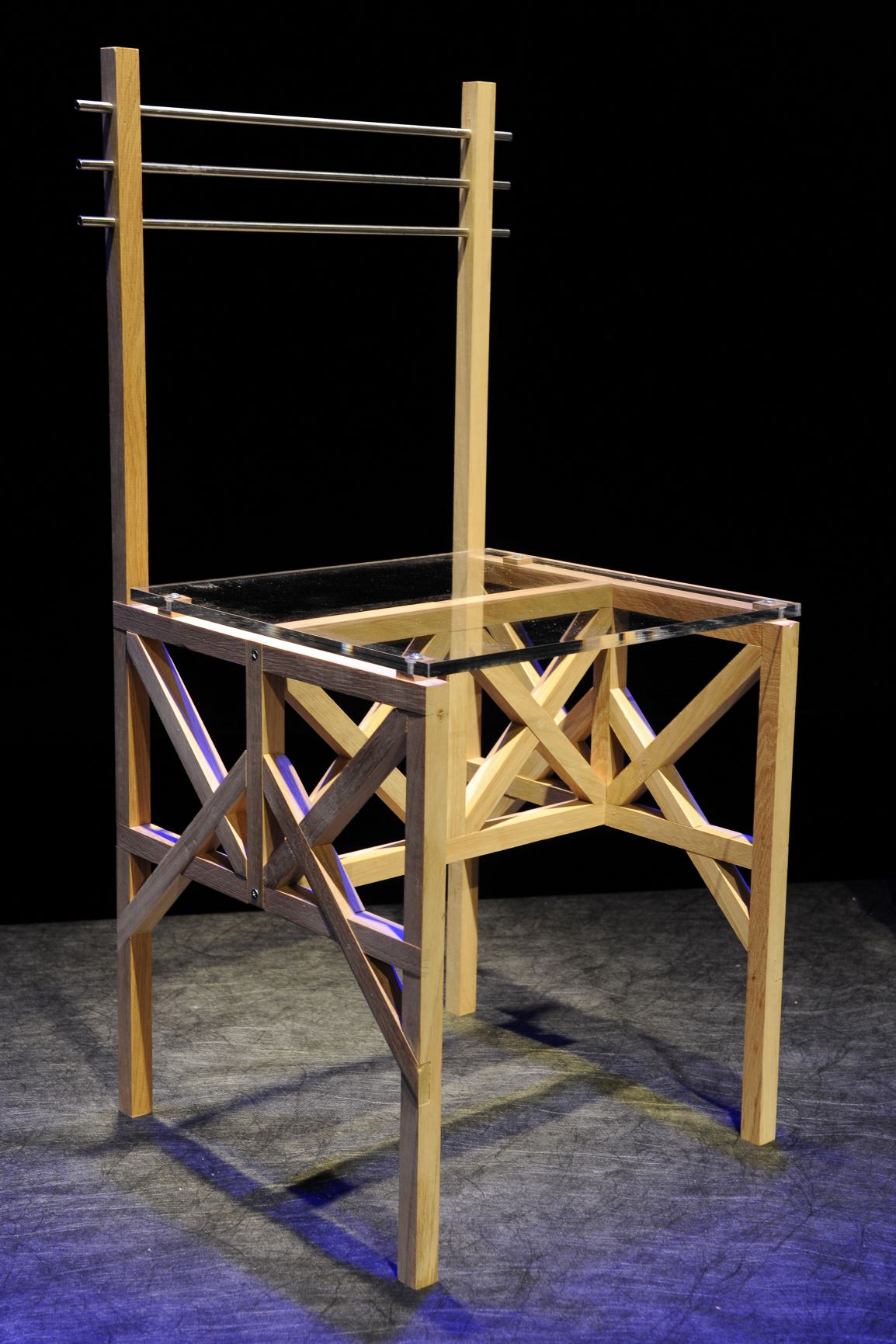 Verjetno je malo ljudem znana podoba bakroreza na naslovnici Laugierjevih Esejov, ki prikazuje prvinsko kočo. Štiri debla dreves, med njimi pa je postavljena strešna kostrukcija iz vej - prakonstrukcija, ki ne govori samo o idealiziranem začetku graditeljstva, ampak tudi o pomembnosti sožitja človeka z naravo. V našem prostoru obstaja edinstven pomnik take prvinske, arhitekture - kozolec. “Kozolec je kultura, ki najbolj določa prepoznavnost krajine v Sloveniji, skozi čas je postal del te krajine, kot drevesa in polja, kakor da bi tam od nekdaj stal.” Stele, 1955. Ljudje v kozolcih prepoznavajo neprecenljivo dediščino, vendar je ne glede na to, svojo pravo vlogo za vedno izgubil. Morda pa je prišel čas, da idejo kozolca, o prvinskem sožitju človeka z naravo in kakovostni uporabi lesa, prenesemo tudi na druge izdelke. Začnimo s stolom. Stol dosledno citira konstrukcijo “toplarja” in je napravljen iz lesenih palic, ki se med seboj vežejo z zarezovanjem in mozničenjem kot pri kozolcih. “Čeli” in “brana” zavetrujejo stol, dodatno togost pa zagotavlja sedalo iz akrilnega stekla, ki omogoča nemoten pogled na mogočno konstrukcijo stola.